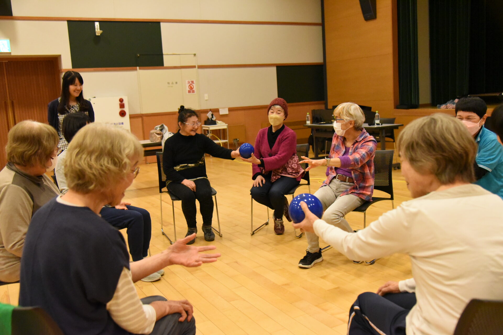 運動習慣に不安のある方でも取り組みやすい内容とし、激しい運動よりも参加者同士の交流と「楽しさ」を重視しながら、イスに座った状態でのエクササイズを中心に、スカーフを使ったやさしいストレッチ、スクリーンに映した2つの数字を同時に描く脳トレ、カラーボールを使ったグループワークなどを行いました。横野氏の軽快な声かけに合わせて自然なコミニュケーションが生まれ、終始和やかな雰囲気で進行しました。