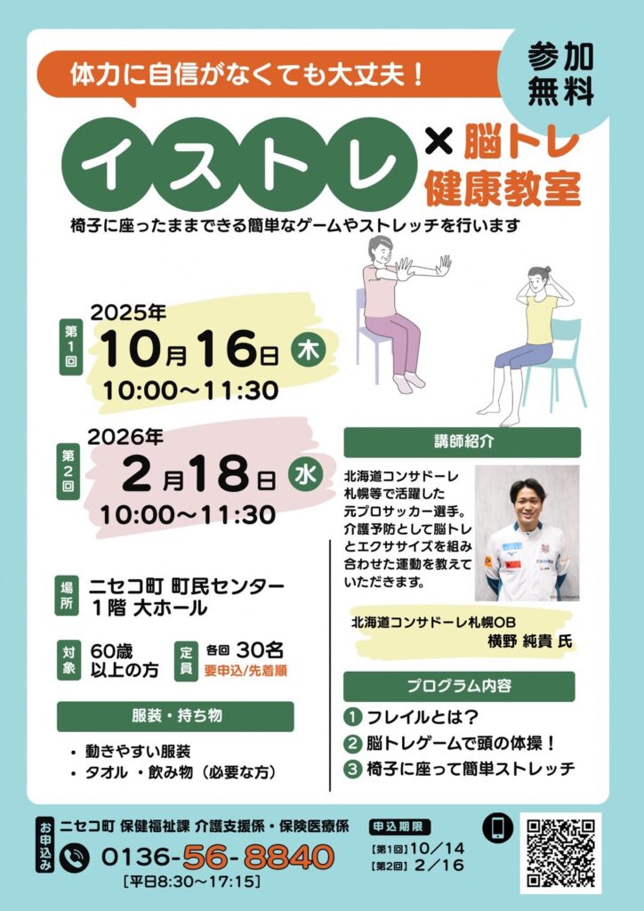 2025年10月16日(木)、弊社はニセコ町より業務委託を受け、「イストレ×脳トレ」健康教室の第1回を実施しました。参加者の皆さまには、イスに座ったままで取り組める運動と脳のトレーニングをご体験いただき、笑顔あふれる時間となりました。