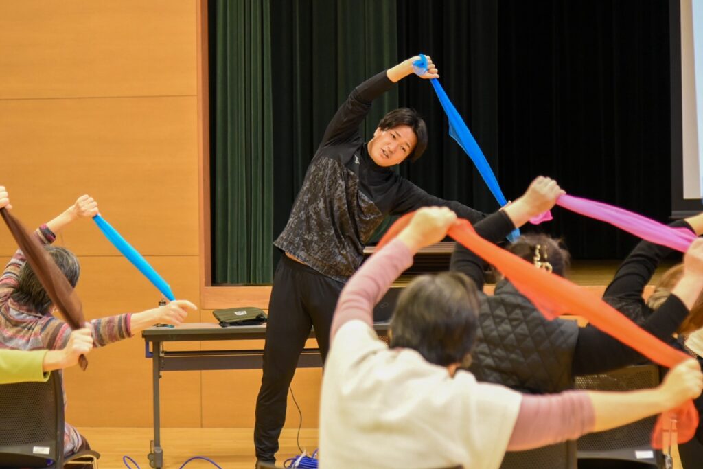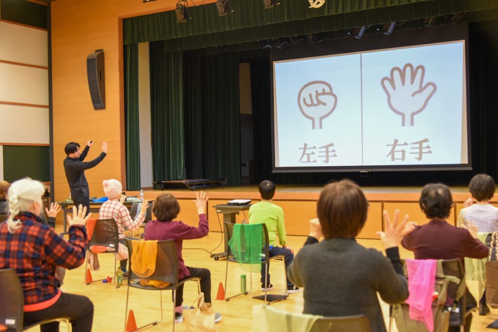 イスに座った状態でのエクササイズを中心に、体をほぐすやさしいストレッチ、スクリーンを利用した脳トレ、カラーボールを使ったグループワークなどを実施しました。横野氏の明るい声かけにより自然なコミュニケーションが生まれ、終始和やかな雰囲気のなかで行われました。